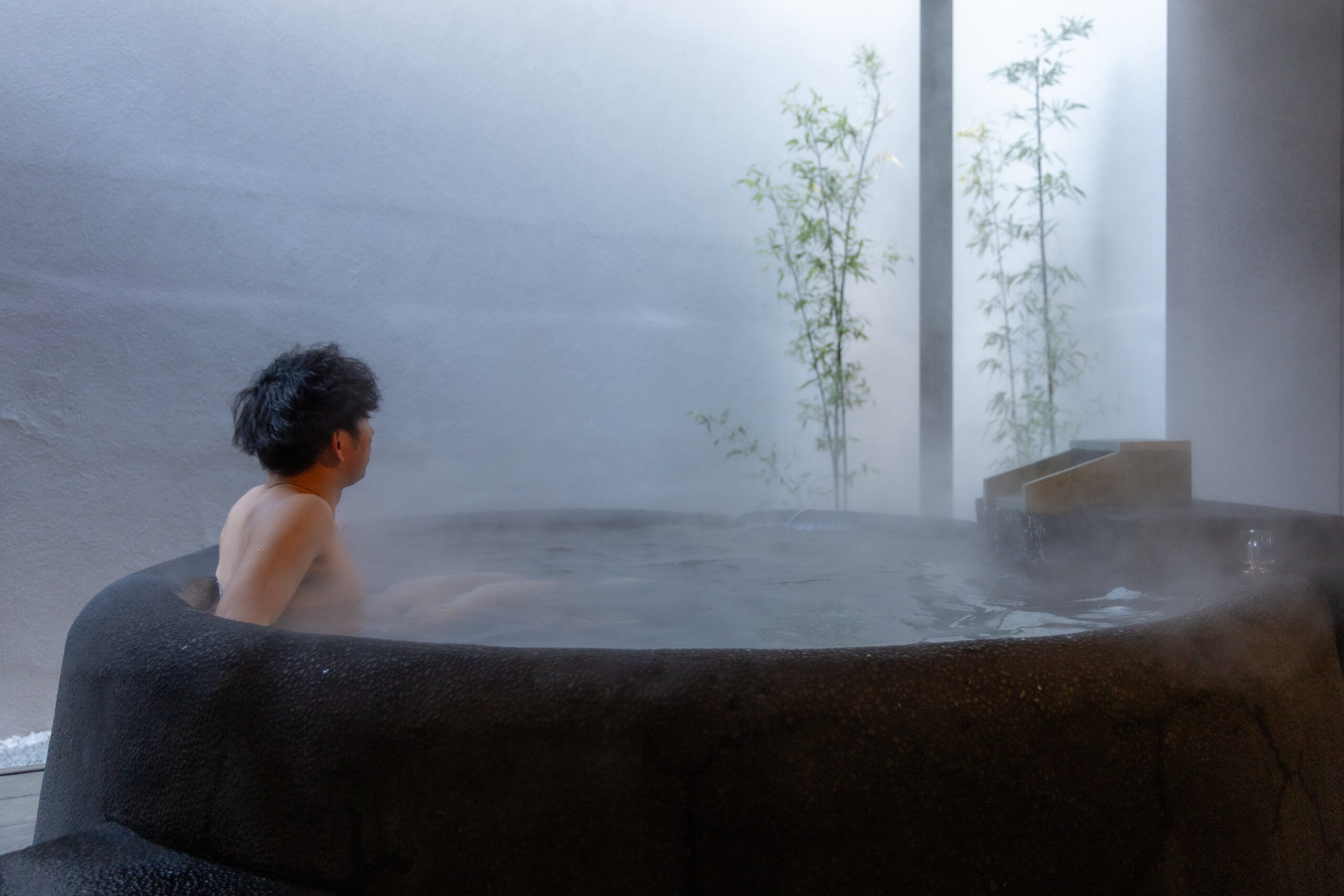 自然石の風合いを活かした左官仕上げの露天風呂と、