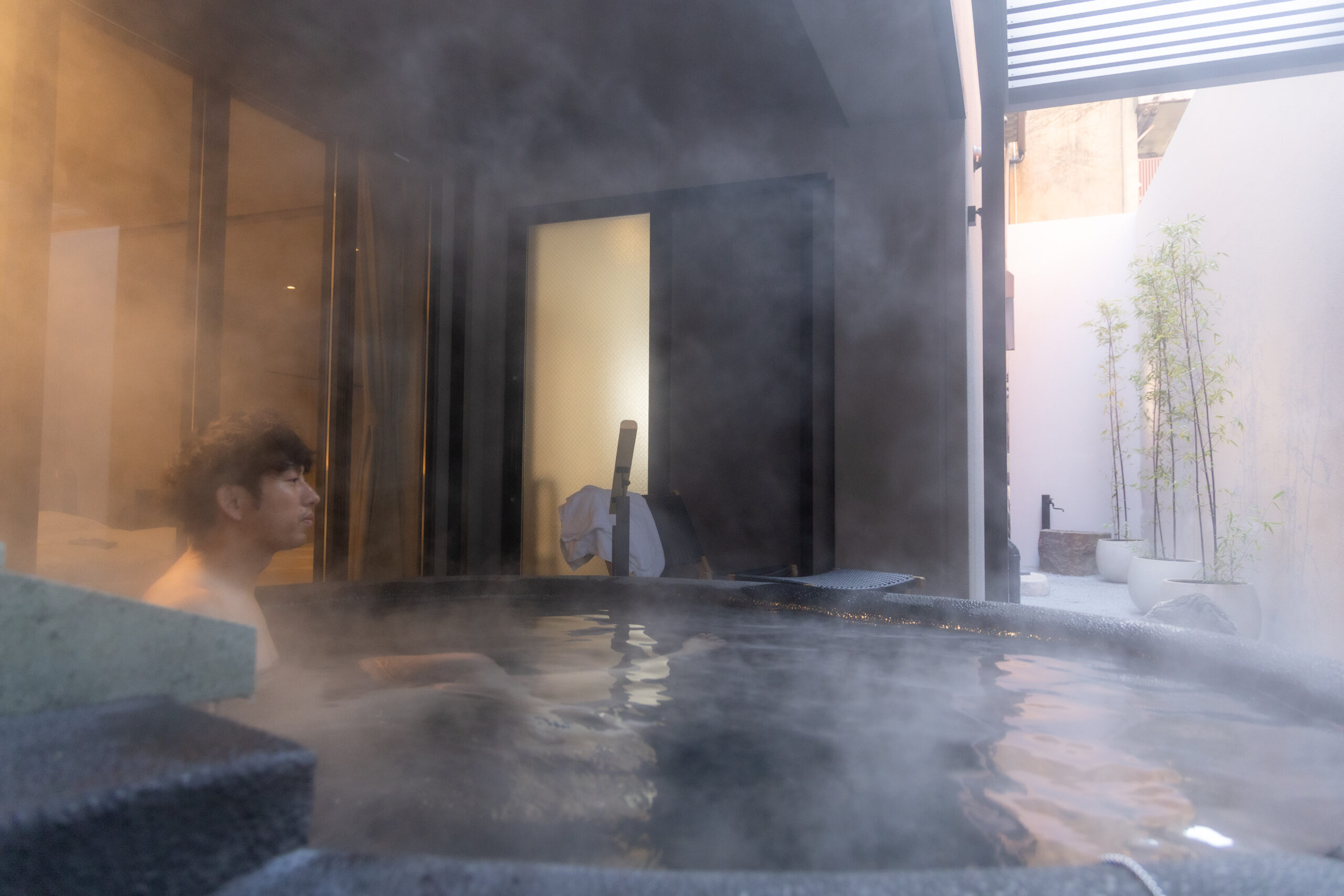 自然石の風合いを活かした左官仕上げの露天風呂と、